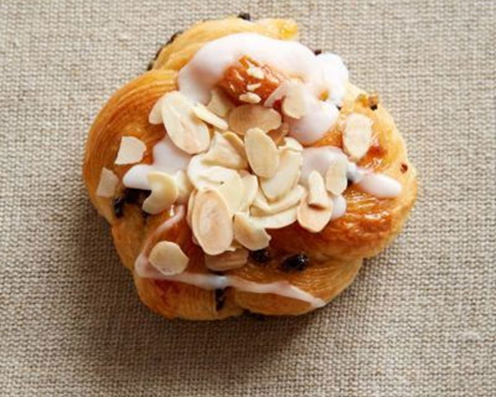Two almond and apricot Danish pastries. Ingredients: Organic White Flour, Milk, Sugar, Salt, Yeast, Apricot Jame, Currants, French Butter, Marzipan, Almonds